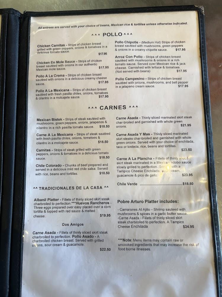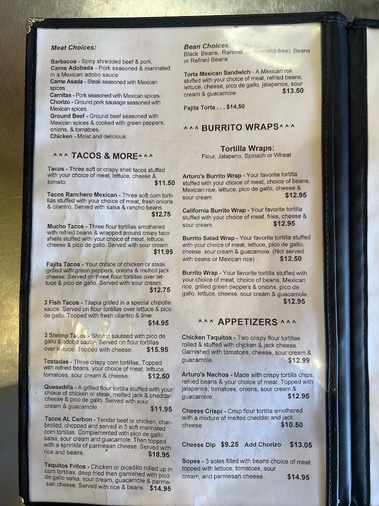 The kids' menu ensures even the little diners find something to enjoy. Each meal features kid-friendly portions without sacrificing quality. The drinks range from traditional Mexican sodas to refreshing iced tea, pairing well with every dish. Arturo's commits to providing an enjoyable culinary experience, balancing variety and authenticity. With 120 dishes that invite exploration, every visit offers something new, ensuring that the menu remains as appealing as the vibrant atmosphere.